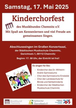 Und so war es am Samstag, 17.5.2025, endlich so weit, ins Andrégymnasium zu Proben und Workshops einzuladen. Neben unserem Chor unter der Leitung von Frau Eichelkraut waren noch der Chor des Gymnasiums Einsiedel, der Chor der Landesschule für Blinde und Sehbehinderte sowie der Kinderchor der Städtischen Musikschule Chemnitz am Start. Für das leibliche Wohl der Kinder sorgten die großen Sängerinnen und Sänger der MBC-Ensembles. Am Abend wurde das Kinderchorfest mit einem Abschlusssingen im sehr gut gefüllten Saal der Städtischen Musikschule beendet.